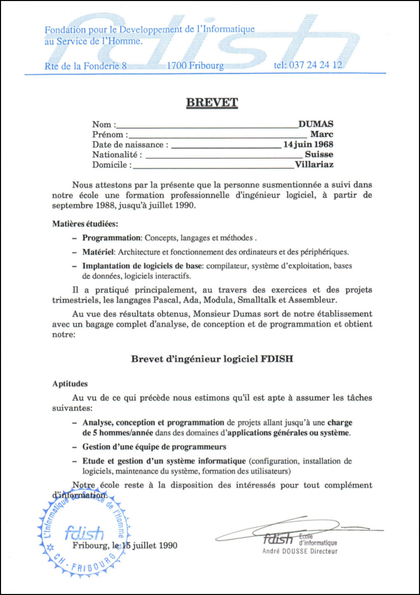 Durant 2 ans, je suis le cursus de l'école FDISH de Fribourg formant des professionnels de l'informatique. En juillet 1990, j'obtiens mon Brevet d'ingénieur logiciel FDISH.
