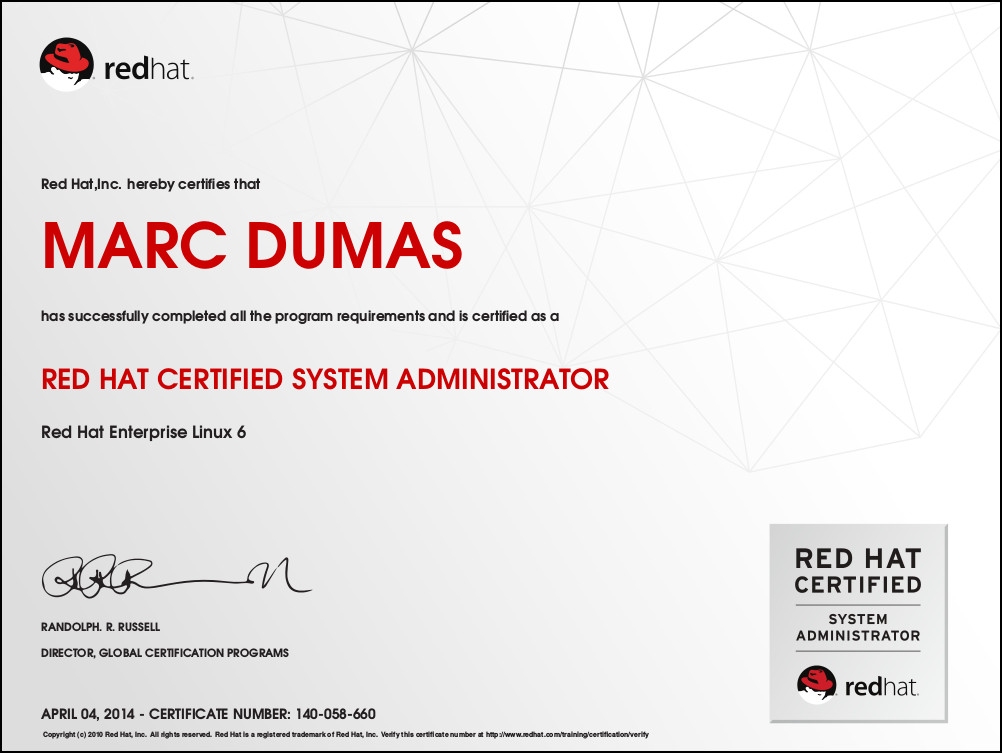 En avril 2014, je passe avec succès l'examen d'Administrateur système certifié Red Hat (RHCSA) à Londres.