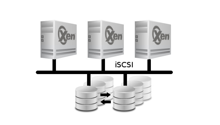 Elle est composée de cinq serveurs configurés en pool et raccordés à un stockage redondant basé sur un cluster haute disponibilité. Les échanges entre ce dernier et les serveurs Xen sont assurés par un lien iSCSI en multipath.